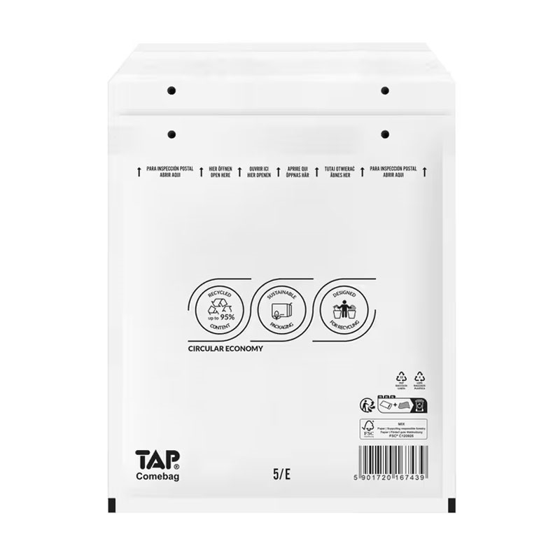 Bublinkové obálky TAP Comebag® jsou navrženy tak, aby poskytly maximální ochranu při zasílání menších a citlivých předmětů. Kombinace pevného papírového povrchu a kvalitní třívrstvé bublinkové fólie zajišťuje vysokou odolnost proti protržení i nárazům. Obálky jsou plně recyklovatelné – papír i bublinkovou vložku lze snadno oddělit a vytřídit. Uzavírání Trifix umožňuje bezpečné zalepení i opakované použití, což z nich dělá praktické, ekologické a ekonomické balení pro e‑shopy, kanceláře i tvůrce.