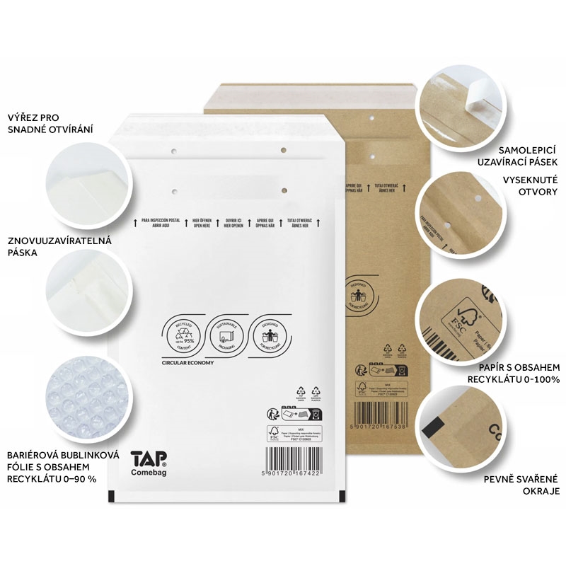Bublinkové obálky TAP Comebag® jsou navrženy tak, aby poskytly maximální ochranu při zasílání menších a citlivých předmětů. Kombinace pevného papírového povrchu a kvalitní třívrstvé bublinkové fólie zajišťuje vysokou odolnost proti protržení i nárazům. Obálky jsou plně recyklovatelné – papír i bublinkovou vložku lze snadno oddělit a vytřídit. Uzavírání Trifix umožňuje bezpečné zalepení i opakované použití, což z nich dělá praktické, ekologické a ekonomické balení pro e‑shopy, kanceláře i tvůrce.