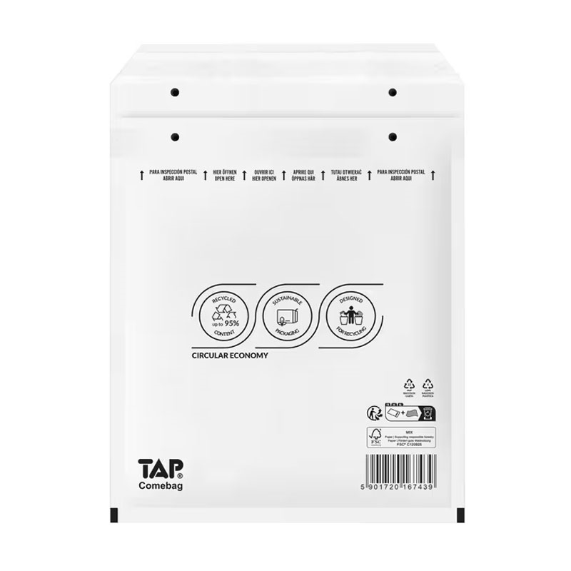 Bublinkové obálky TAP Comebag® jsou navrženy tak, aby poskytly maximální ochranu při zasílání menších a citlivých předmětů. Kombinace pevného papírového povrchu a kvalitní třívrstvé bublinkové fólie zajišťuje vysokou odolnost proti protržení i nárazům. Obálky jsou plně recyklovatelné – papír i bublinkovou vložku lze snadno oddělit a vytřídit. Uzavírání Trifix umožňuje bezpečné zalepení i opakované použití, což z nich dělá praktické, ekologické a ekonomické balení pro e‑shopy, kanceláře i tvůrce.