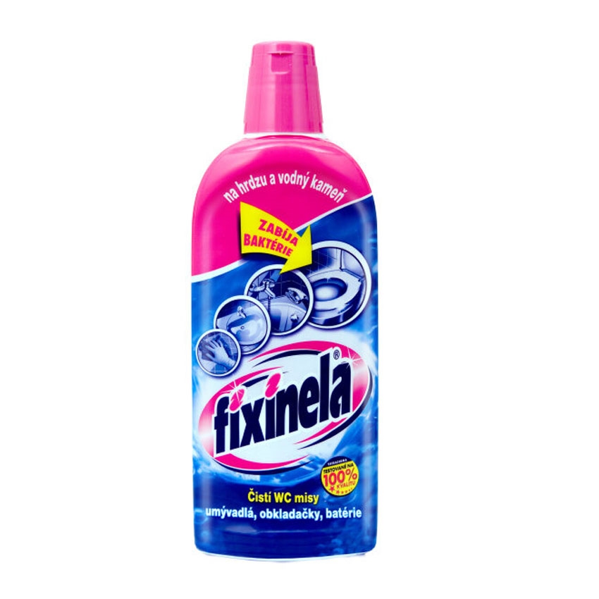 Fixinela tekutý čisticí prostředek je vysoce účinný kyselý čistič na umyvadla, vany, obkladačky, vodovodní baterie a WC mísy. Poradí si i s velmi znečištěnými plochami, odstraní rez, vodní a močový kámen i další usazeniny.