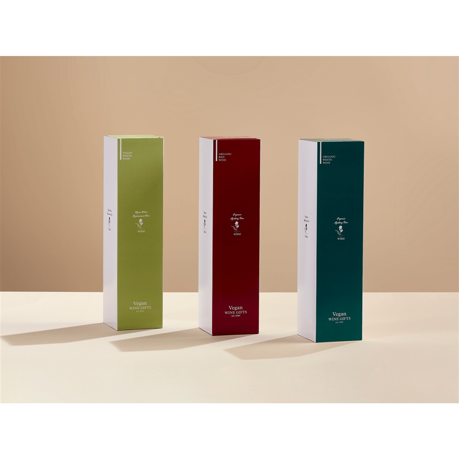 Stylová krabice na víno s automatickým dnem a vlastním potiskem. Horní otevírání, mírně lesklá fólie chrání barevnost designu. Ideální pro prezentaci vína, prosecca, whisky, koňaku nebo olivového oleje v maloobchodě. Vhodná pro horní i střední police – snadno ji přizpůsobíte každé lahvi i etiketě.