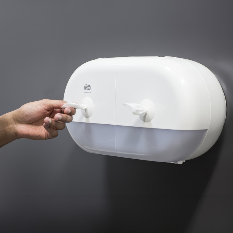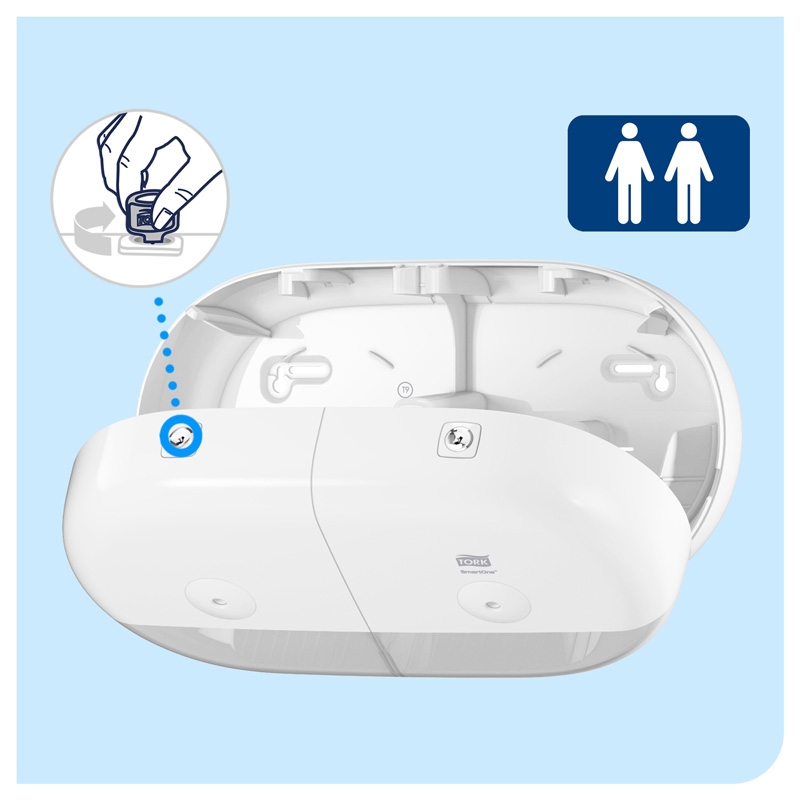 Mini zásobník na toaletní papír Tork SmartOne® Twin v provedení Elevation představuje moderní a účinný systém výdeje, vhodný do náročných podmínek toalet a umýváren s vysokou návštěvností. Kapacita na dvě role a výdej po jednom útržku snižují v porovnání s tradičními zásobníky na jumbo role spotřebu až o 40 %. Díky tomu vystačí každá role pro více návštěvníků. Zásobníky Tork Elevation se vyznačují funkčním, moderním designem, který na vaše hosty udělá trvalý dojem. .
