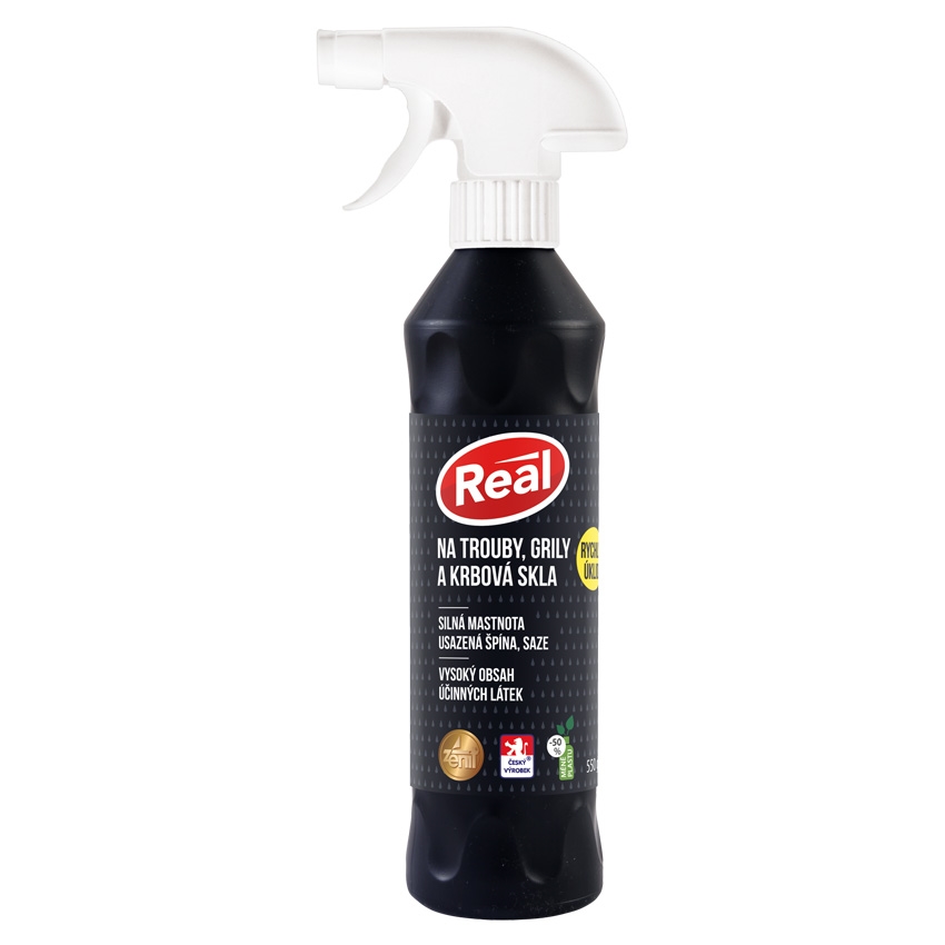 Real na trouby, grily a krbová skla je vysoce koncetrovaný čisticí prostředek, který si poradí i s přípálenými hrnci. Působí samočinně, bez mechanických zásahů. Stačí nastříkat a setřít. Nejsilnější koncentrovaný prostředek s vysokým obsahem účinných látek. Nebezpečí: Způsobuje těžké poleptání kůže a poškození očí. Může být korozivní pro kovy.