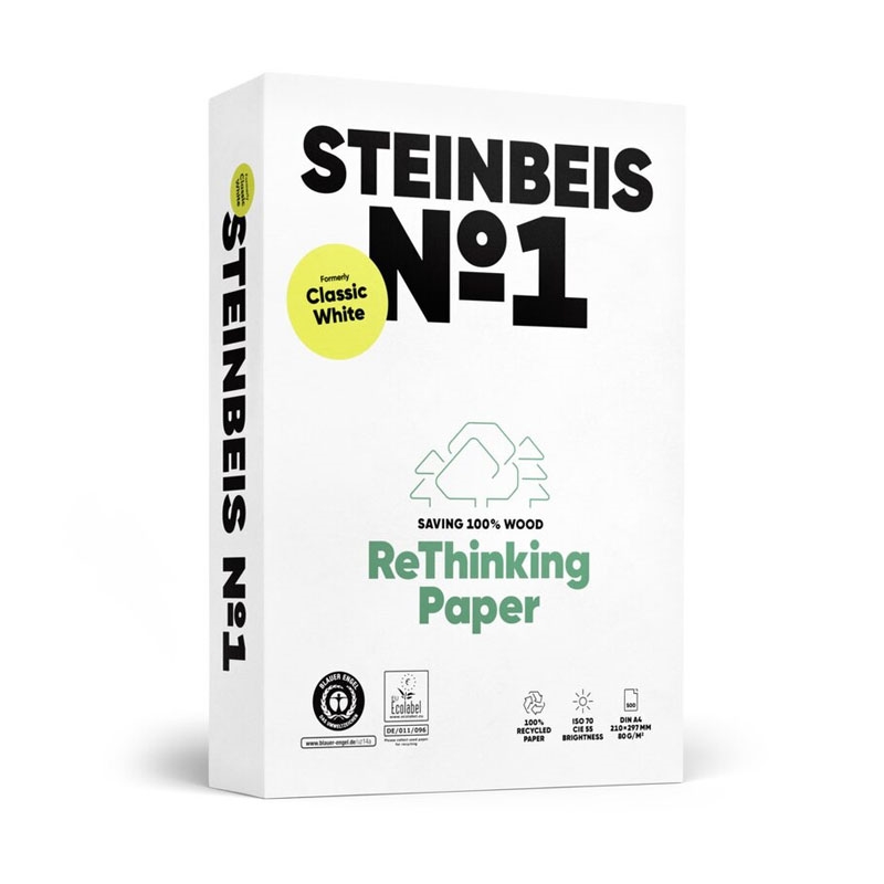 Recyklovaný xerografický papír Steinbeis No. 1 je kvalitní kancelářský papír vyrobený ze 100% recyklovaných vláken. Nabízí vysokou bělost, výbornou tiskovou kvalitu a spolehlivý chod v tiskárnách i kopírkách. Je vhodný pro každodenní kancelářský tisk, interní dokumenty, korespondenci i archivaci. Představuje ekologickou alternativu ke klasickému bílému papíru.